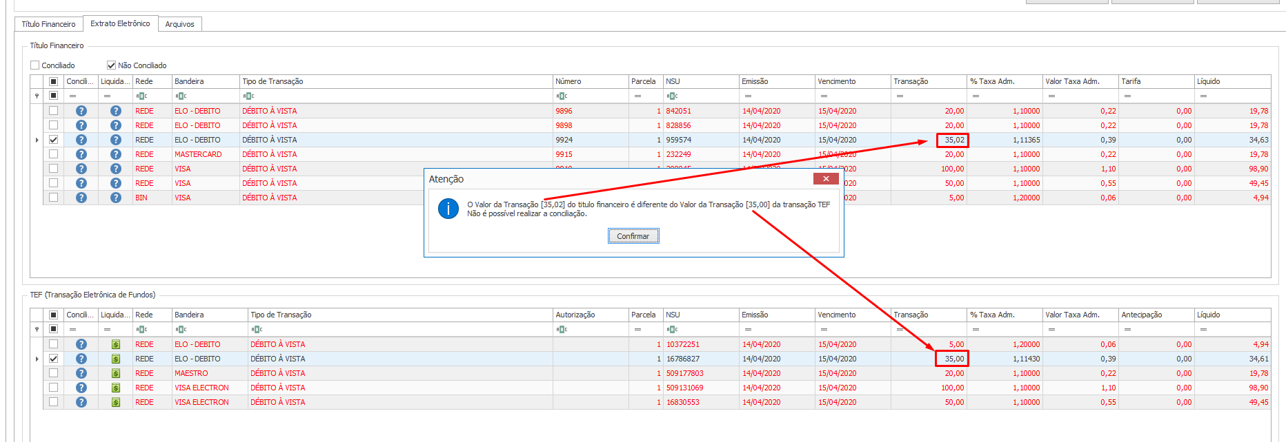 Nessa etapa, ao conciliar, o sistema altera no título o que estiver divergente do extrato mediante autorização do usuário, podendo ser as informações da rede, bandeira, tipo de transação, NSU e valor líquido. A busca de compatibilidade entre transações leva em consideração os valor da transação e a data de emissão.