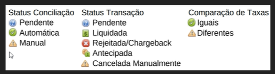A pesquisa na aba Título Financeiro sinaliza com imagens e cores a situação da conciliação e do pagamento da transação. Também mostra se as taxas cobradas pela adquirente estão de acordo com as taxas do sistema.